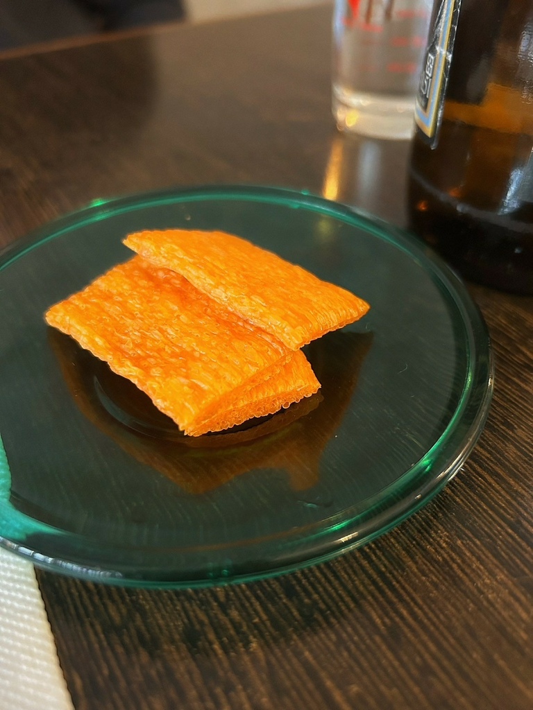 這橘橘的一片一片原來是南瓜條!頭一次吃的我可是一吃就愛上,口感蓬鬆有嚼勁,越嚼會散發出南瓜微甜的味道,整體說不出的特別卻好好吃...