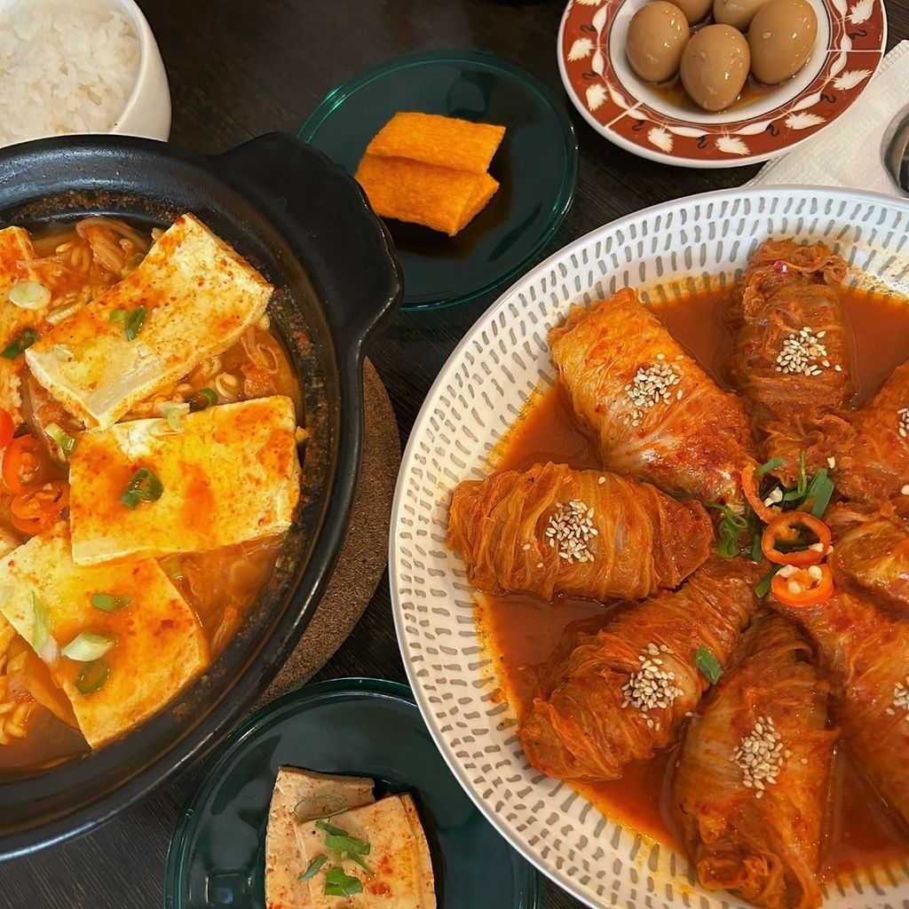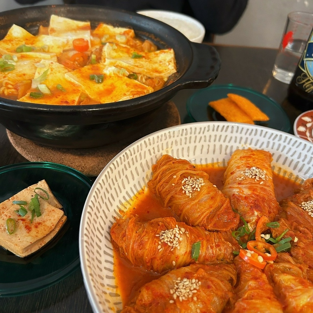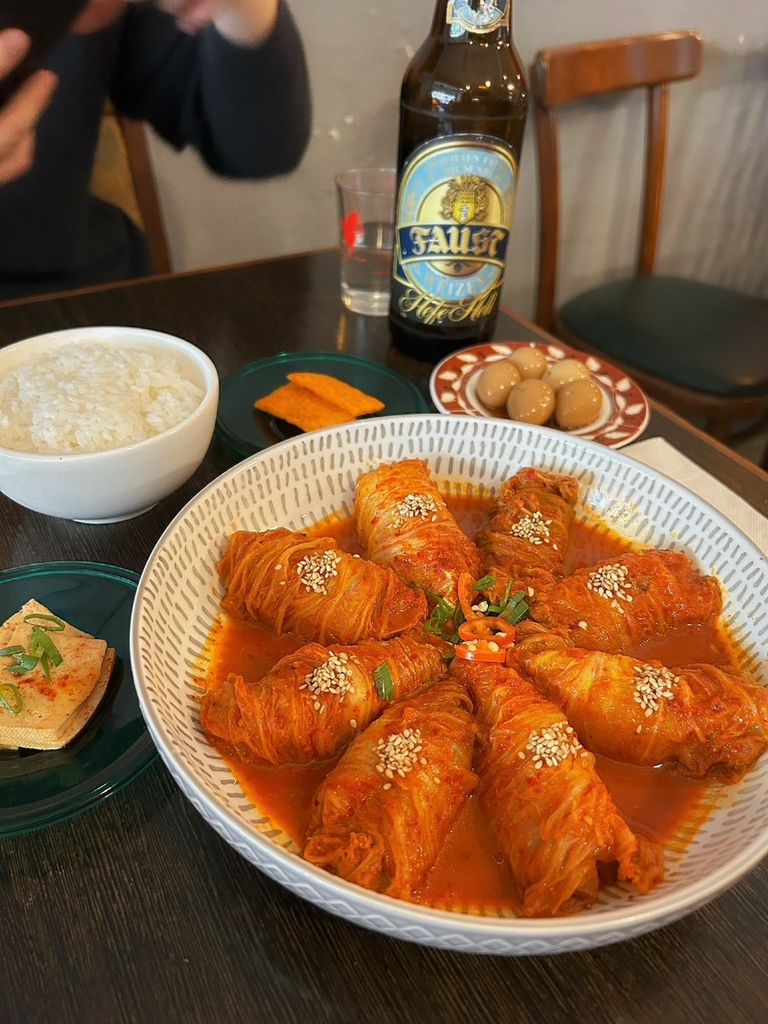 這擺盤也太美了吧!一份泡菜捲捲豬五花共有八個~微辣泡菜口味的醬汁偏甜,口味偏重,酸辣開胃,絕對必須加點白飯!菜捲內包有厚實五花肉,口感非常嫩~超級好吃!